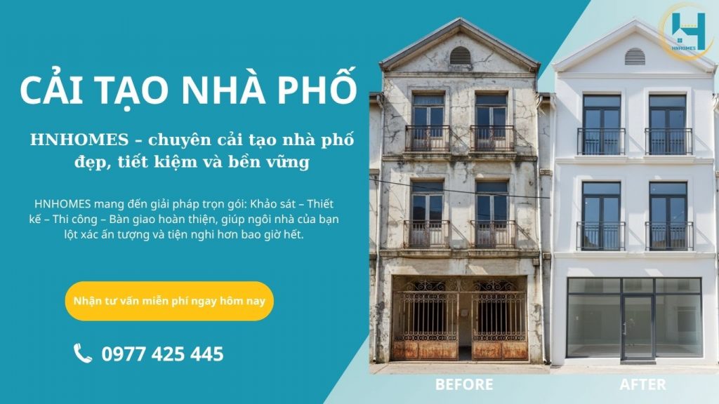 Nếu bạn đang tìm kiếm đơn vị cải tạo nhà phố trọn gói, HNHOMES chính là lựa chọn đáng tin cậy. Với nhiều năm kinh nghiệm trong lĩnh vực thiết kế – thi công – cải tạo nhà ở, HNHOMES đã đồng hành cùng hàng trăm gia đình trong việc “thay áo mới” cho tổ ấm của mình.